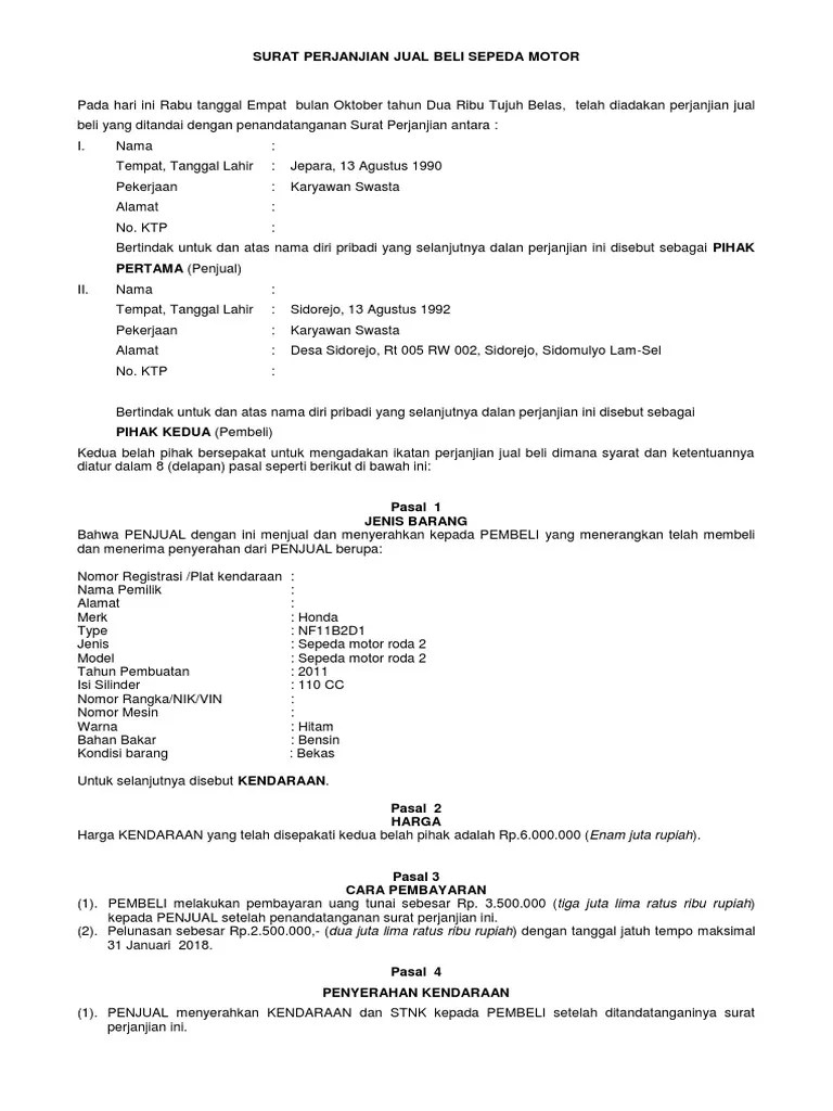 Demikian surat perjanjian ini kami buat dalam keadaan sadar dan tanpa . Pada umumnya penggunaan surat perjanjian dapat kita temukan pada saat proses transaksi jual beli sepeda motor baik secara kredit ataupun tunai. Tahap yang satu ini hanya dilakukan saat anda membeli atau menjual sepeda motor bekas. Contoh surat perjanjian jual beli sepeda motor. Fungsinya tidak lain adalah sebagai bukti bahwa pada hari dan tangga . Surat perjanjian jual beli motor adalah surat yang dibuat sebagai bukti hitam di atas putih antar kedua .